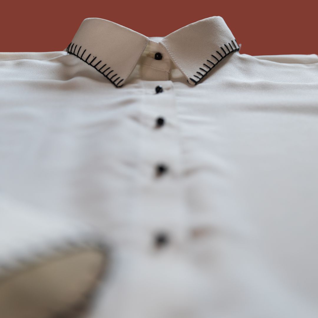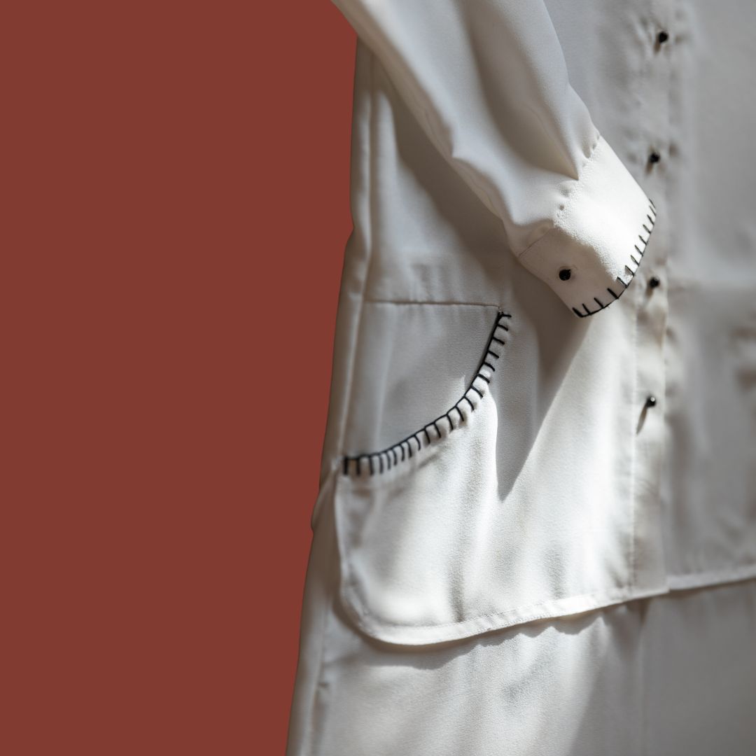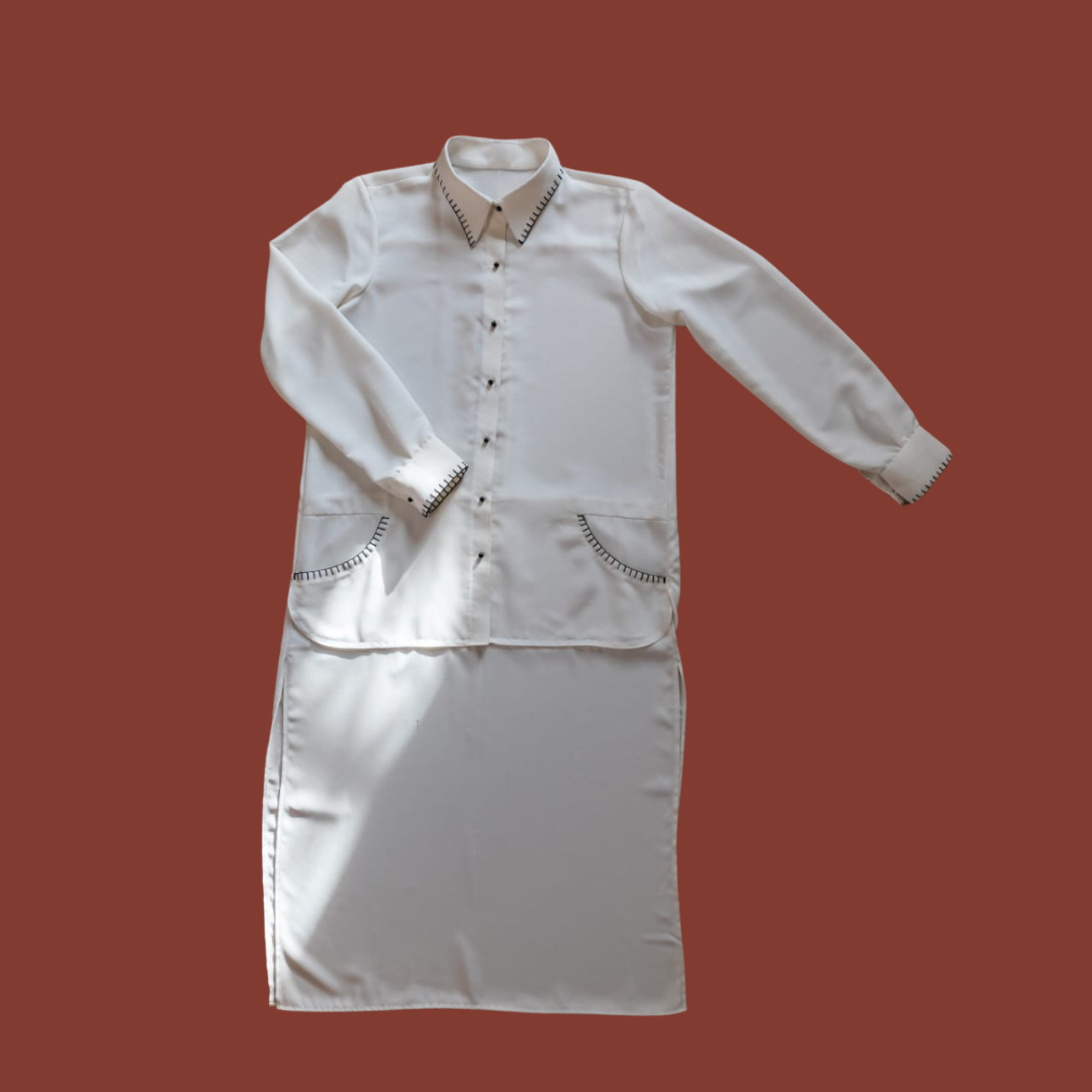A button-down, collar shirt made to look like our Pakistani long shirts that we love to wear anytime, anywhere! The black blanket stitch detail contrasts perfectly on the white collar and cuffs.